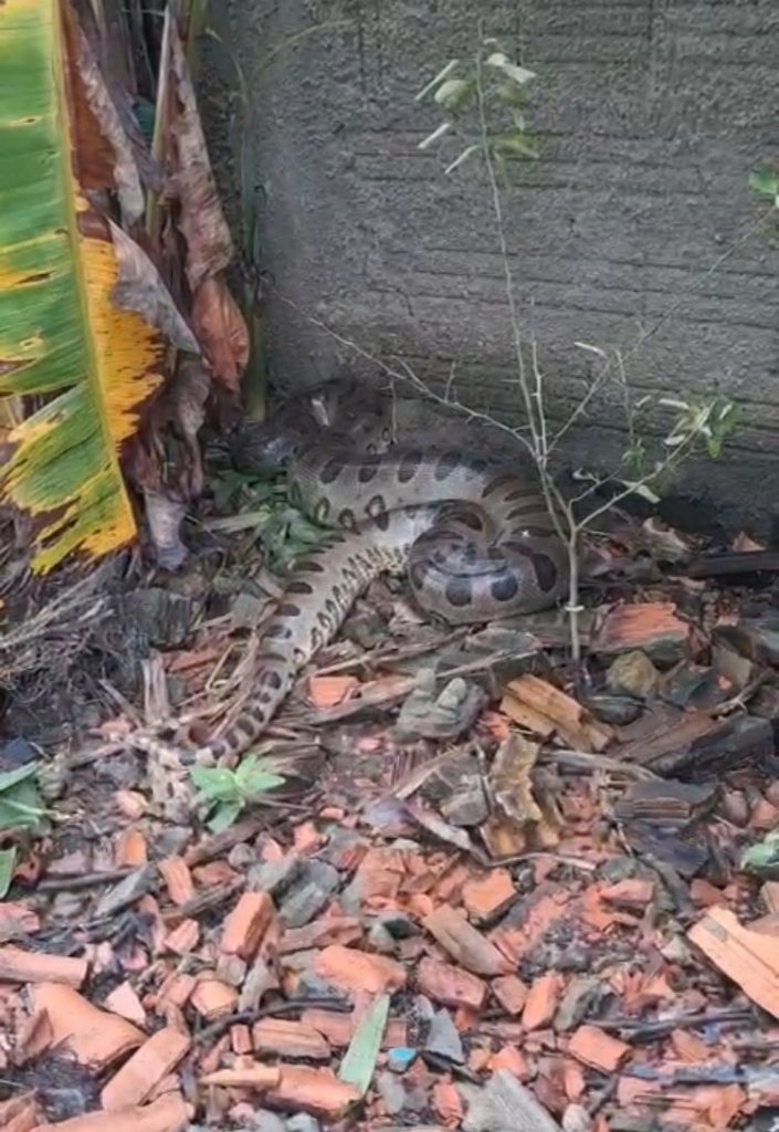 O susto dessa vez é que a cobra permaneceu no quintal mesmo com a ‘barriga cheia’.